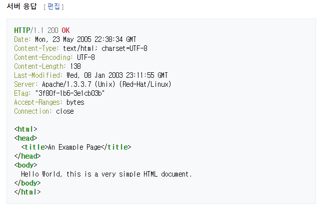 서버 응답은 상태 표시행(상태코드, Reason Message), 응답 헤더 필드, 빈 줄, 기타 메시지의 형태로 이루어진다.